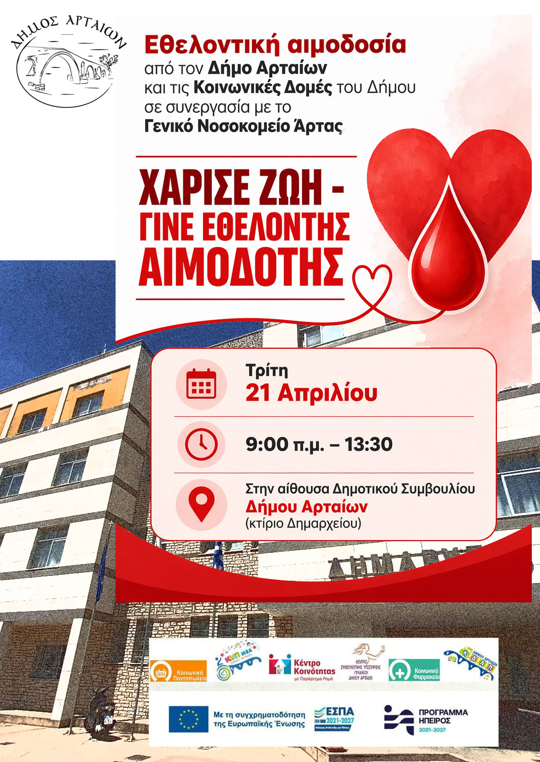 Την Τρίτη 21 Απριλίου 2026, από τις 9:00 π.μ. έως τις 13:30 μ.μ., στην αίθουσα του Δημοτικού Συμβουλίου (κτήριο Δημαρχείου Άρτας), με μία απλή πράξη γεννιέται η ελπίδα και η ζωή για συνανθρώπους που το έχουν ανάγκη. Η συμμετοχή όλων είναι πολύτιμη.
