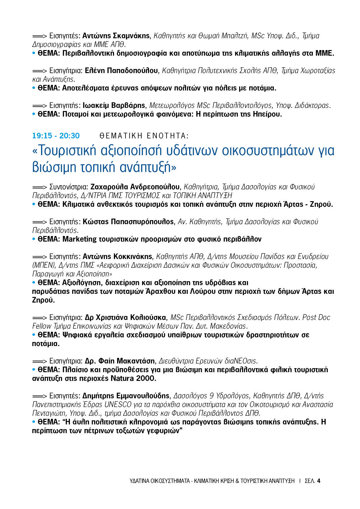 Την επόμενη ημέρα – Σάββατο 14 Σεπτεμβρίου – στην αίθουσα του Επιμελητηρίου Άρτας θα αναπτυχθεί από τους εισηγητές το θέμα: «Τουριστική αξιοποίηση υδάτινων οικοσυστημάτων για βιώσιμη τοπική ανάπτυξη»