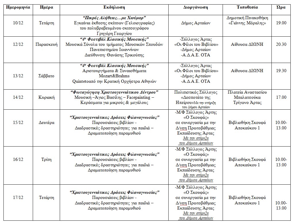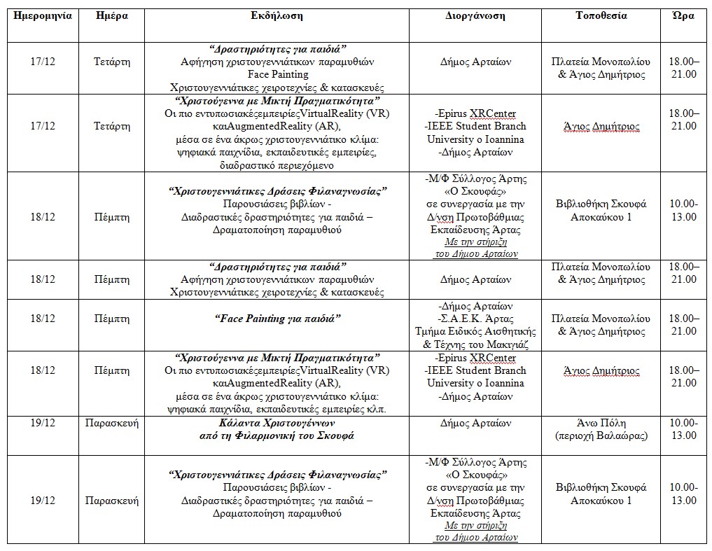 Ο Δήμος Αρταίων παρουσιάζει και φέτος ένα ιδιαίτερα πλούσιο και ποικιλόμορφο πρόγραμμα χριστουγεννιάτικων εκδηλώσεων, γεμάτο μουσική, παιδικές δραστηριότητες, θεατρικές παραστάσεις, χορό, εκπαιδευτικές δράσεις και παραδοσιακά δρώμενα που θα γεμίσουν την πόλη με φως, χαρά και ζεστασιά. Στόχος μας είναι μικροί και μεγάλοι να βιώσουν το πνεύμα των γιορτών μέσα από εμπειρίες που ενώνουν την κοινότητα και αναδεικνύουν τον πολιτισμό του τόπου μας.