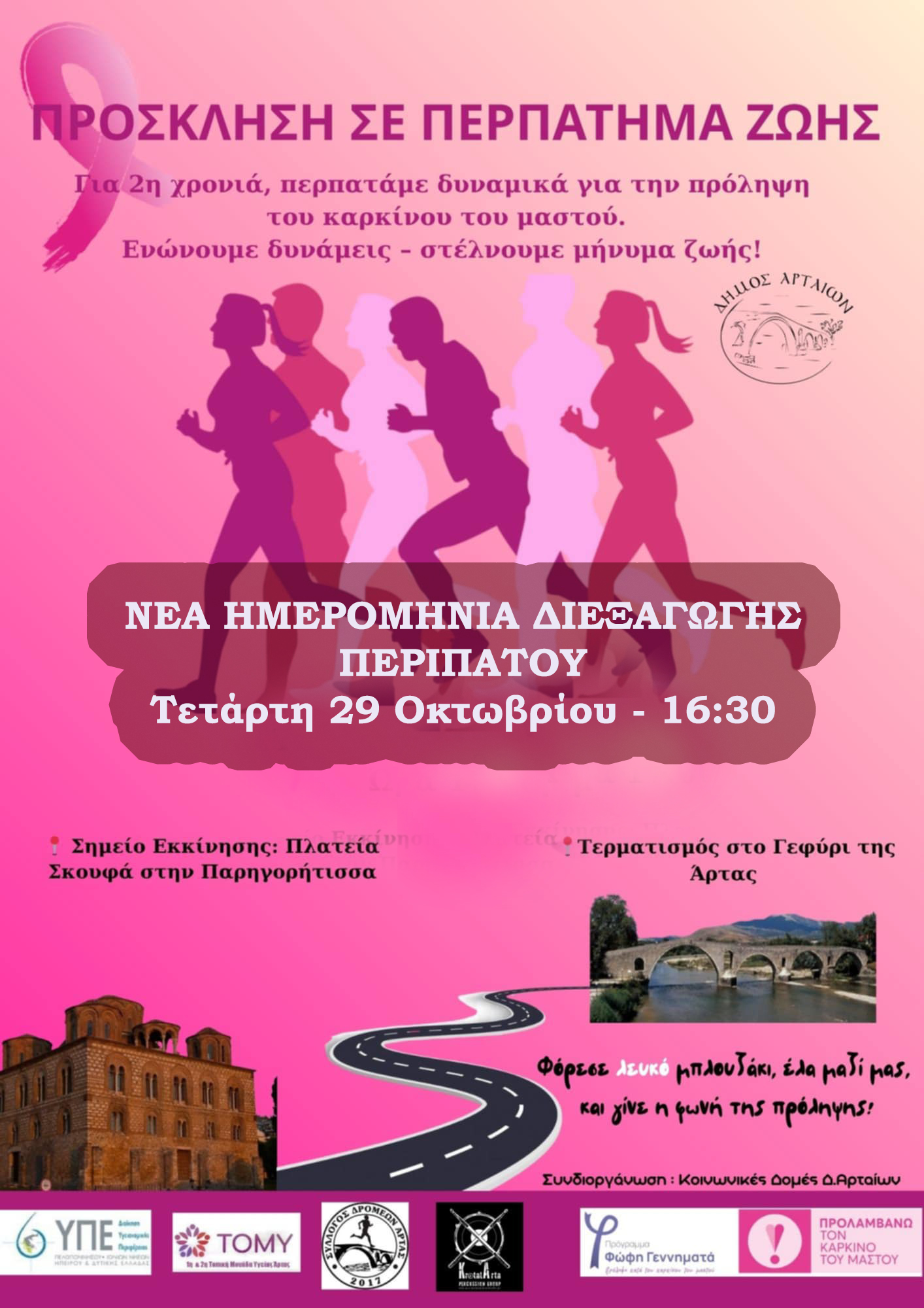 Για 2η συνεχόμενη χρονιά, στο πλαίσιο του «Ροζ Οκτώβρη», Μήνα Πρόληψης και Ευαισθητοποίησης για τον Καρκίνο του Μαστού, οι Κοινωνικές Δομές του Δήμου Αρταίων, η 1η και 2η Τοπική Μονάδα Υγείας Άρτας, σε συνεργασία με τον Σύλλογο Δρομέων Άρτας, συνδιοργανώνουν συμβολικό δυναμικό περίπατο με μήνυμα ζωής και πρόληψης.