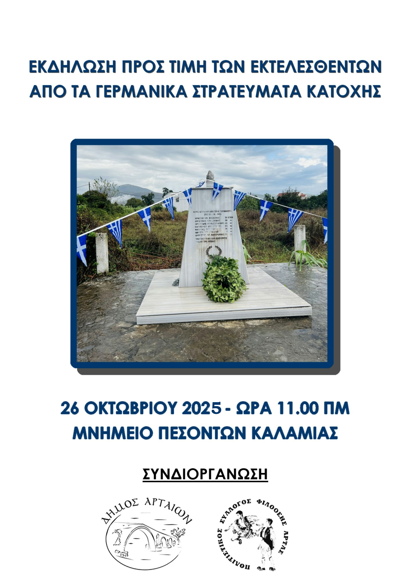 Η εκδήλωση θα πραγματοποιηθεί την Κυριακή 26 Οκτωβρίου 2025 και ώρα 11:00 π.μ., στο μνημείο των εκτελεσθέντων στην Καλαμιά.