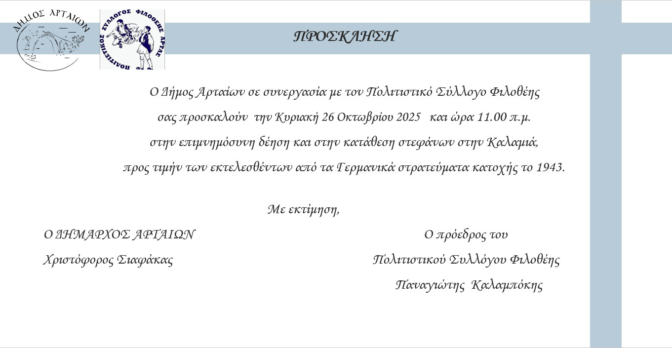 Ο Δήμος Αρταίων, σε συνεργασία με τον Πολιτιστικό Σύλλογο Φιλοθέης, τιμά και φέτος τη μνήμη των θυμάτων που εκτελέστηκαν από τα Γερμανικά στρατεύματα κατοχής το 1943.