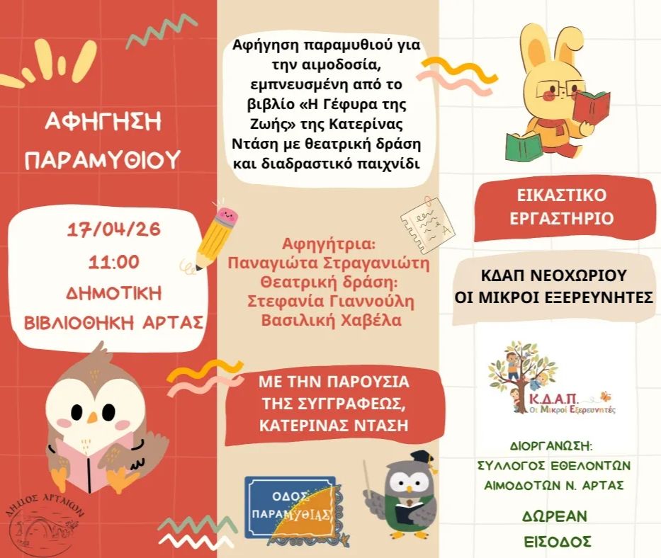 Ο Δήμος Αρταίων, με αφορμή την Παγκόσμια Ημέρα Βιβλίου, στηρίζει τη δράση που διοργανώνει ο Σύλλογος Εθελοντών Αιμοδοτών ν. Άρτας, αφιερωμένη στην αξία της προσφοράς και της αιμοδοσίας.