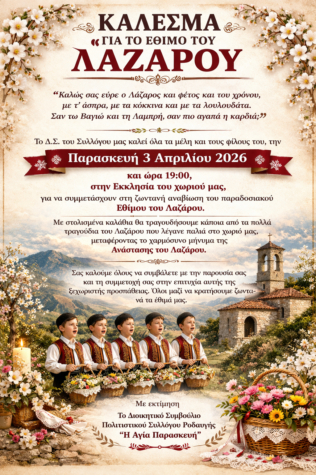 Το παραδοσιακό εθίμου του Λαζάρου, μια όμορφη πολιτιστική εκδήλωση που αναβιώνει μνήμες και ήθη του τόπου.