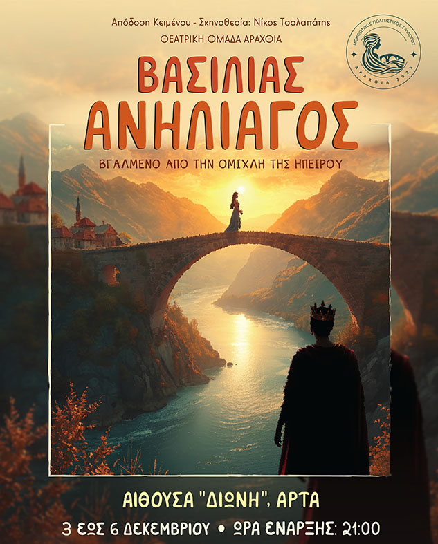 Η θεατρική ομάδα του Συλλόγου παρουσιάζει την πρώτη της παράσταση, «Ο Βασιλιάς Ανήλιαγος», έναν λαϊκό μύθο που συναντάται σε όλη την Ελλάδα και αφηγείται την τραγική ιστορία ενός βασιλιά καταδικασμένου να μην δει ποτέ το φως του ήλιου. Το έργο ζωντανεύει σε ένα σκοτεινό, φανταστικό βασίλειο στις όχθες του Αράχθου, με ατμόσφαιρα και μουσική εμπνευσμένες από την παράδοσή μας.