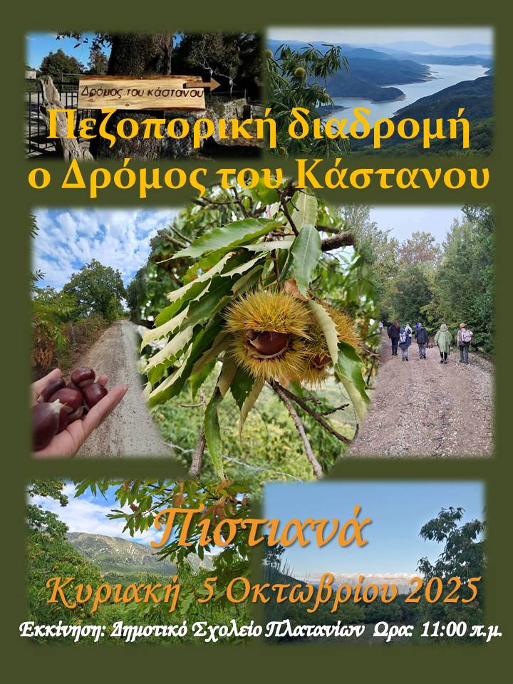Η πεζοπορική διαδρομή «Δρόμος του Κάστανου», μήκους 7χλμ, έχει σημείο εκκίνησης και τερματισμού το Δημοτικό Σχολείο Πλατανίων Πιστιανών, στην είσοδο του χωριού, είναι ήπια κι απευθύνεται σε μικρούς και μεγάλους, μυημένους και μη.