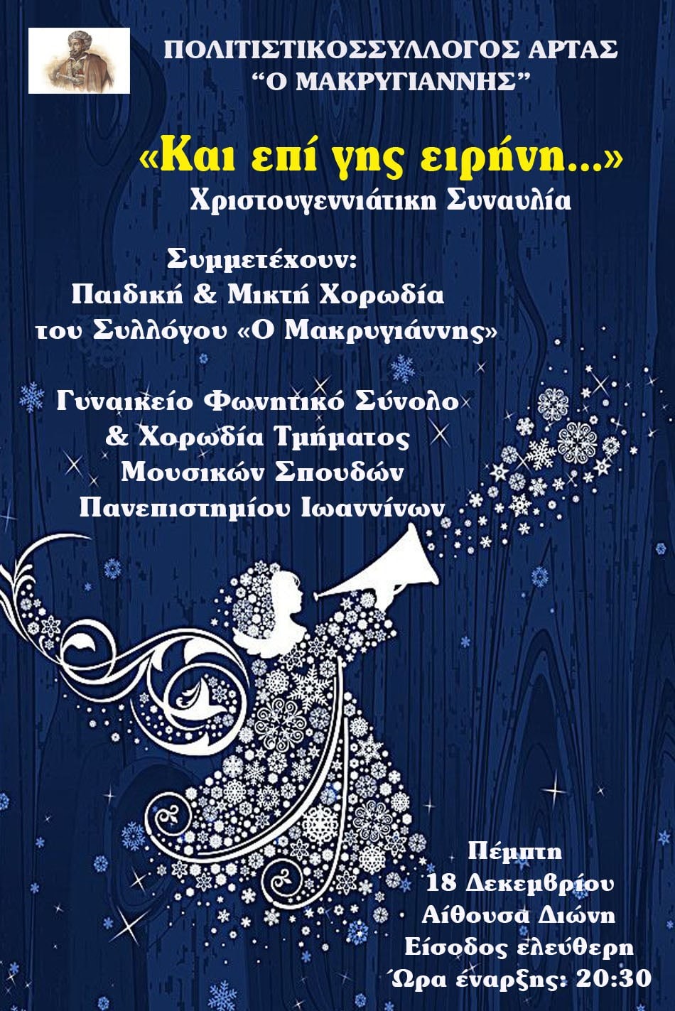Ο Πολιτιστικός Σύλλογος Άρτας «Ο Μακρυγιάννης» προσκαλεί το κοινό στη Χριστουγεννιάτικη Συναυλία με τον τίτλο «Και επί γης ειρήνη…», μια βραδιά αφιερωμένη στο πνεύμα των Χριστουγέννων, με μουσική, συγκίνηση και μηνύματα ειρήνης και ελπίδας.