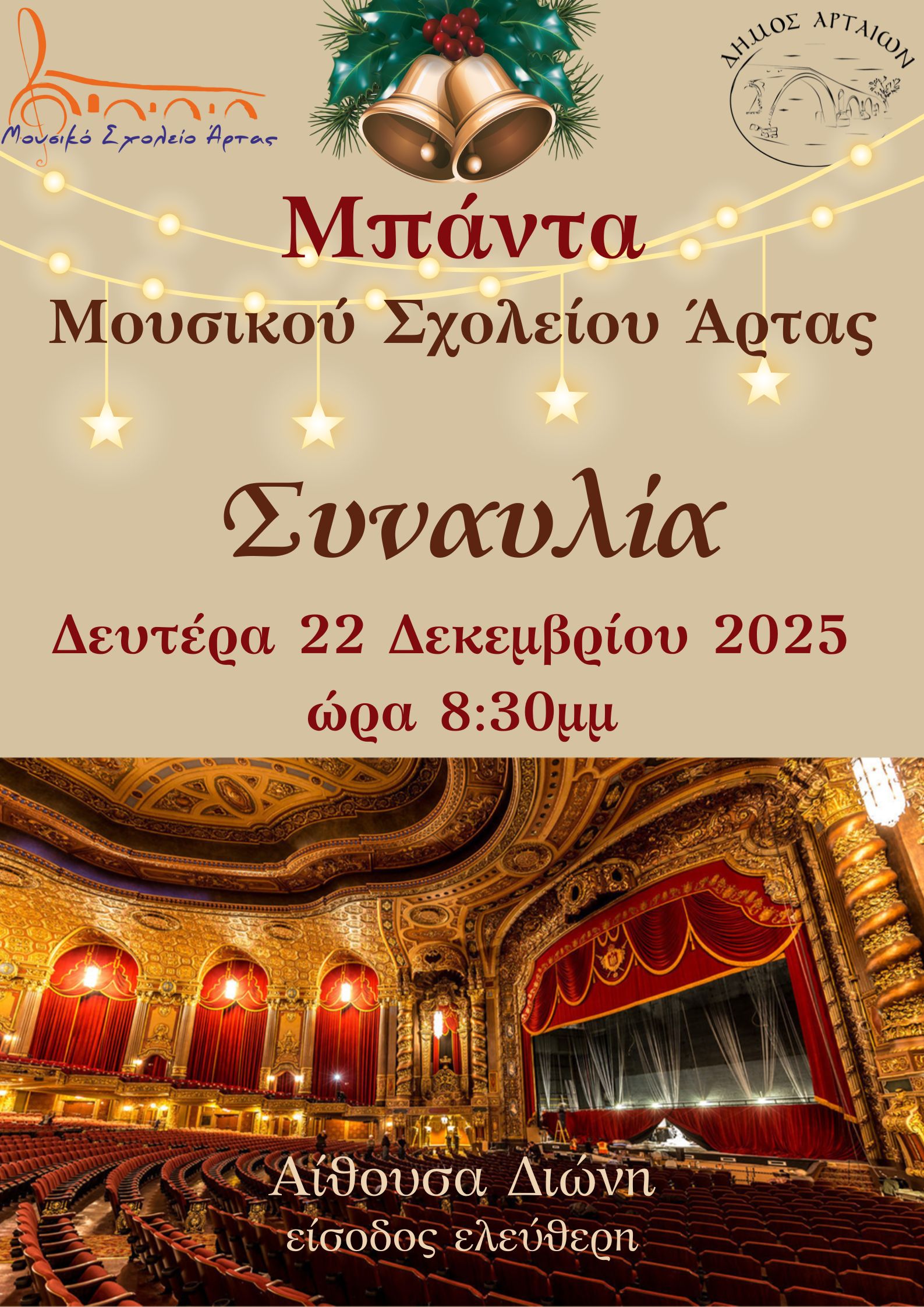Το Μουσικό Σχολείο Άρτας σας προσκαλεί στη συναυλία που θα δώσει η Μπάντα του σχολείου την ερχόμενη Δευτέρα 22 Δεκεμβρίου 2025, στην αίθουσα Διώνη, στις 8.30μμ.