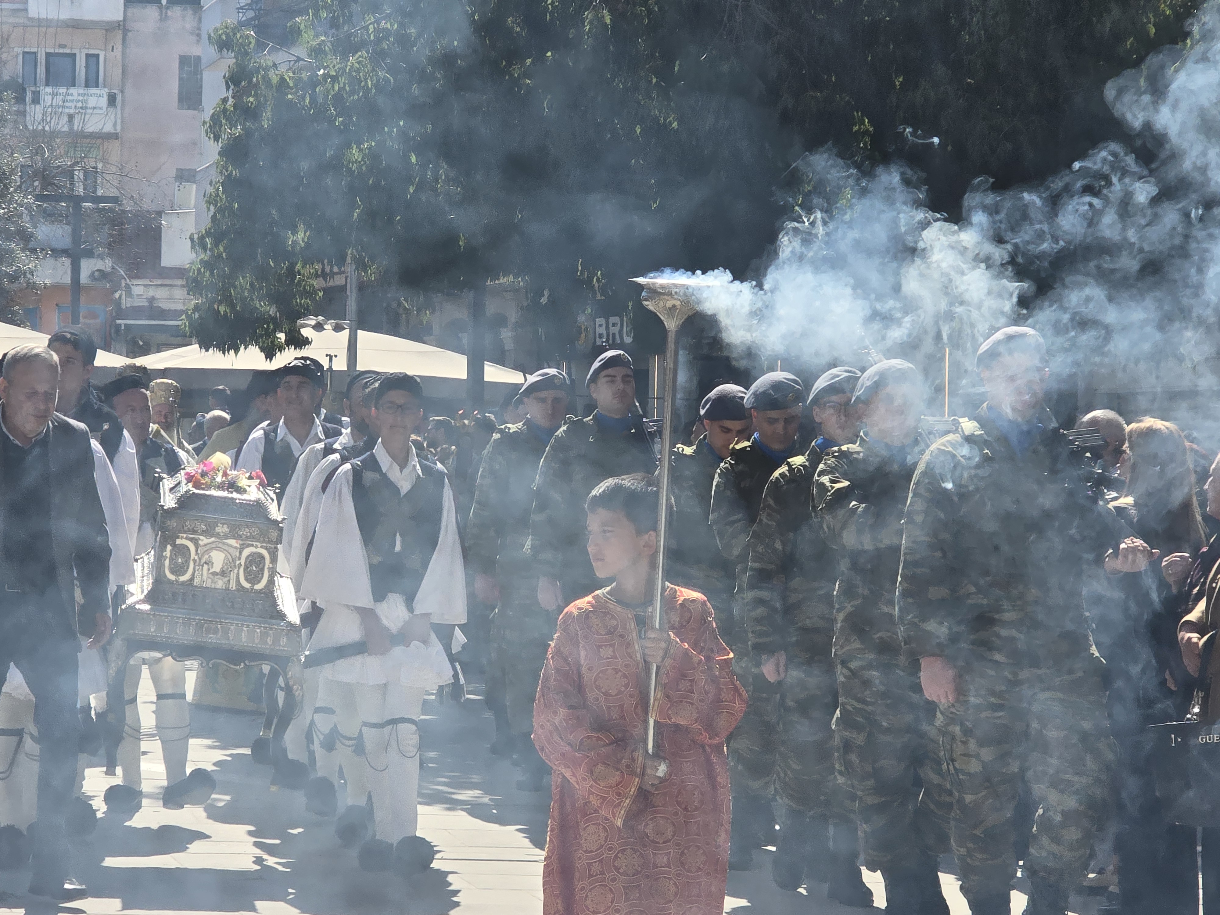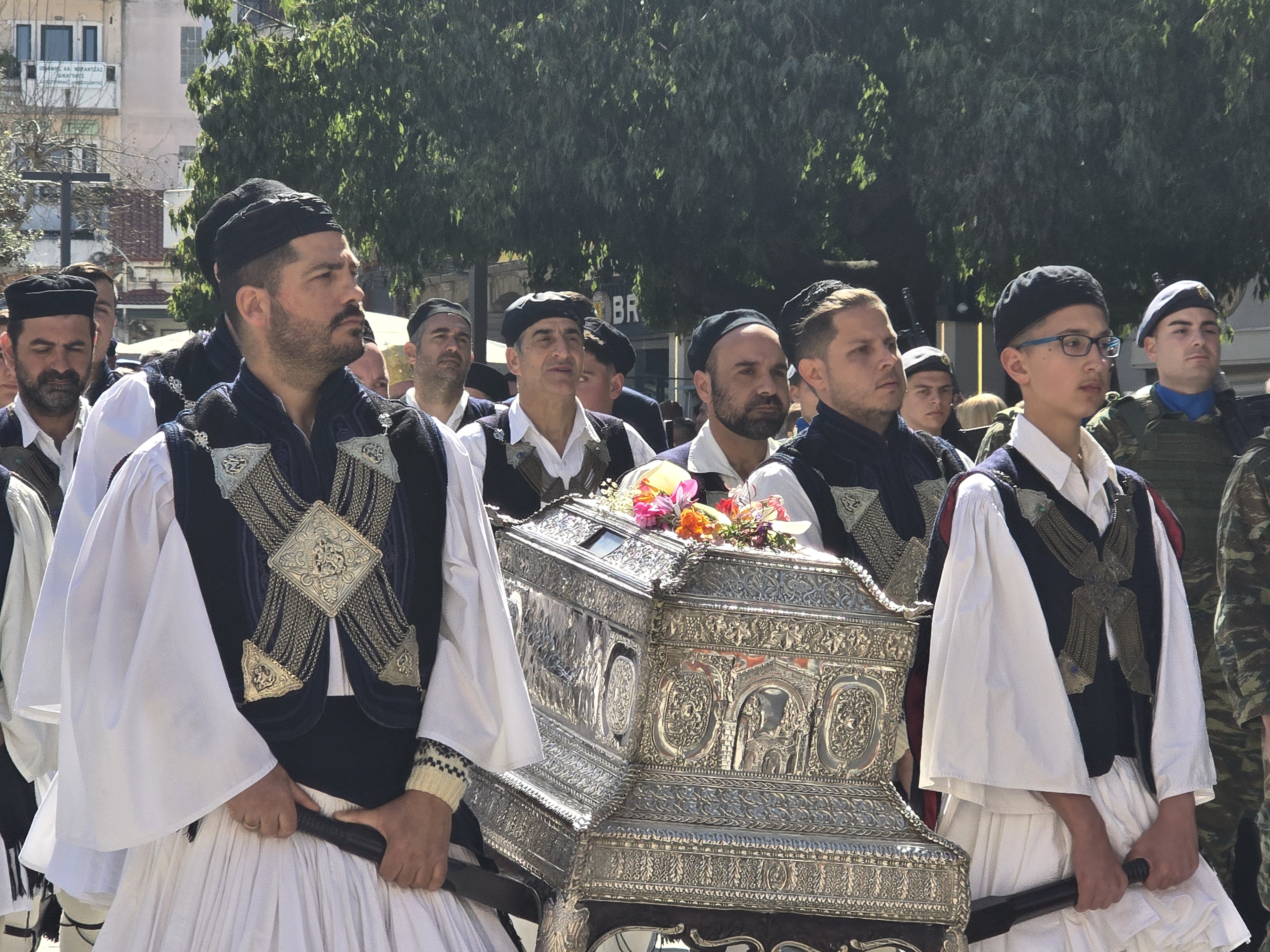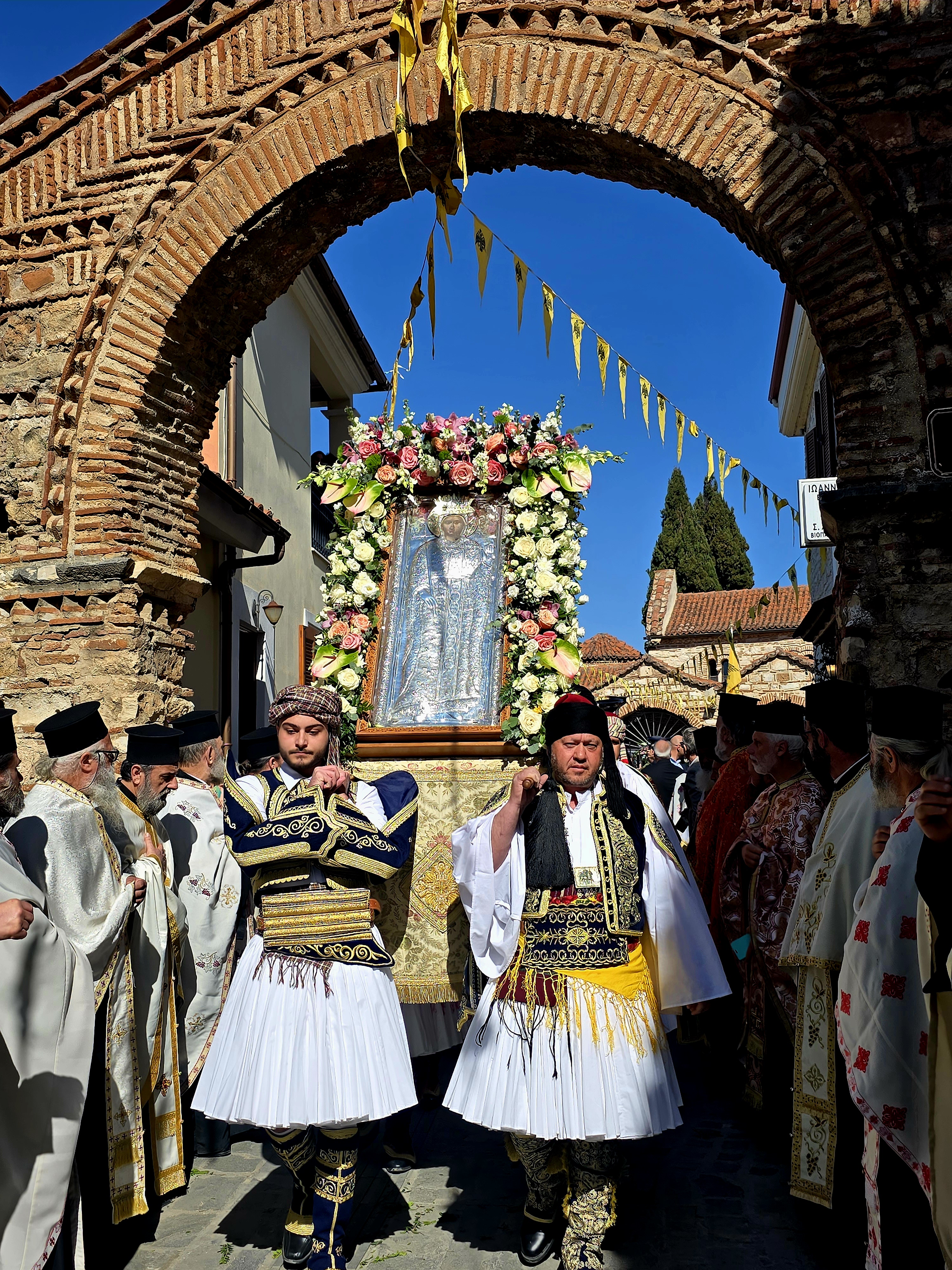 Ακολούθησε η καθιερωμένη λιτάνευση των ιερών λειψάνων και της εικόνας Της, στους δρόμους της πόλης, με τη συνοδεία φιλαρμονικών και τη συμμετοχή των αρχών, στρατιωτικών αγημάτων και πλήθους κόσμου. Λόγω των εργασιών του Open Mall στην οδό Σκουφά, η πομπή ξεκίνησε από τον Ιερό Ναό της Αγίας Θεοδώρας και κινήθηκε σε κεντρικούς δρόμους της πόλης, επιστρέφοντας και πάλι στον ναό.