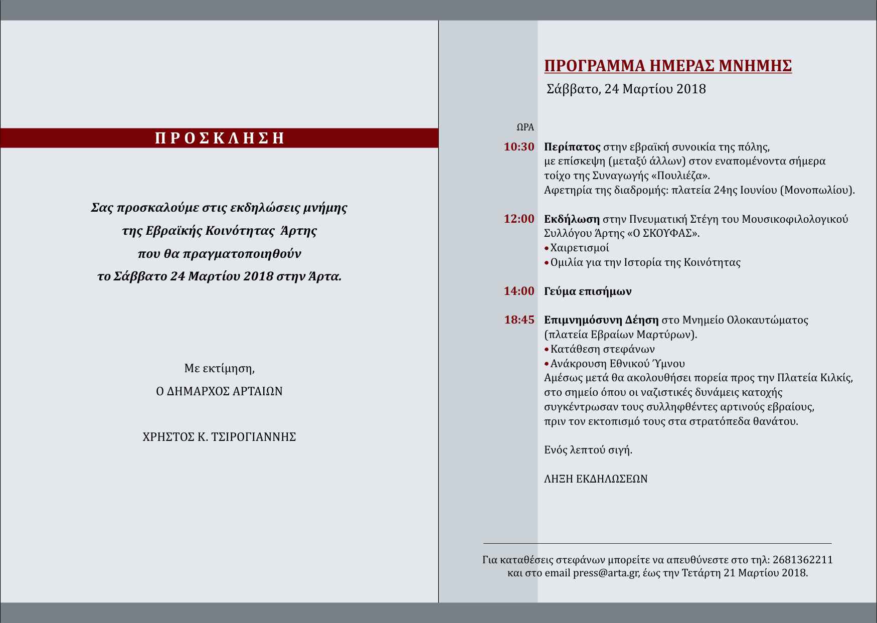 Σειρά εκδηλώσεων με τις οποίες τιμά την ημέρα μνήμης της Εβραϊκής Κοινότητας Άρτης διοργανώνει το Σάββατο 24 Μαρτίου 2018 ο Δήμος Αρταίων, με αφορμή τη συμπλήρωση 74 ετών από τη σύλληψη των Αρτινών Εβραίων (24 Μαρτίου 1944) από τα Γερμανικά Στρατεύματα.