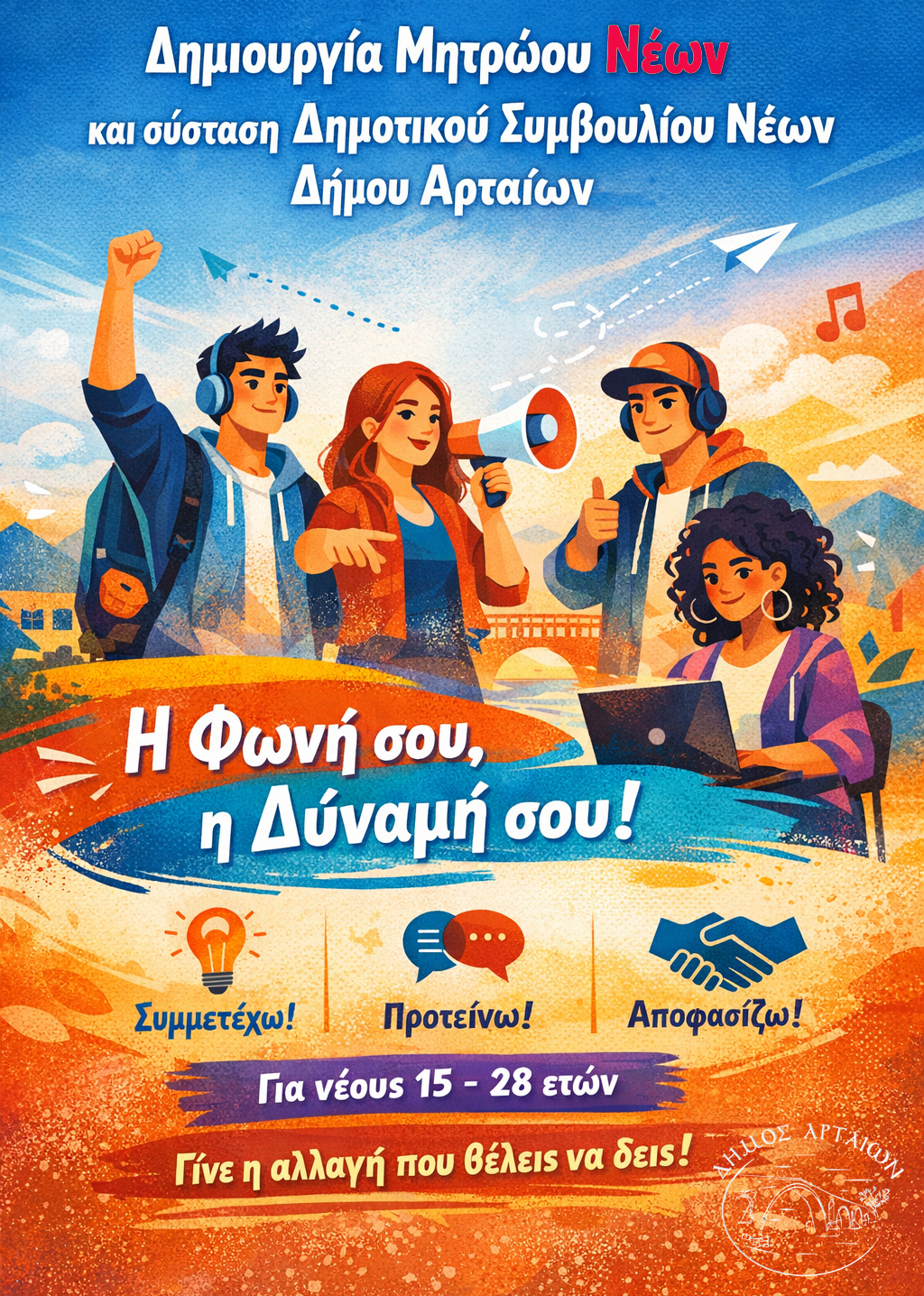 Ο Δήμος Αρταίων ενημερώνει ότι παρατείνεται η προθεσμία εγγραφής στο Μητρώο Νέων, στο πλαίσιο της διαδικασίας για τη σύσταση του Δημοτικού Συμβουλίου Νέων. Η νέα καταληκτική ημερομηνία εγγραφής ορίζεται έως και την 15η Μαρτίου 2026.