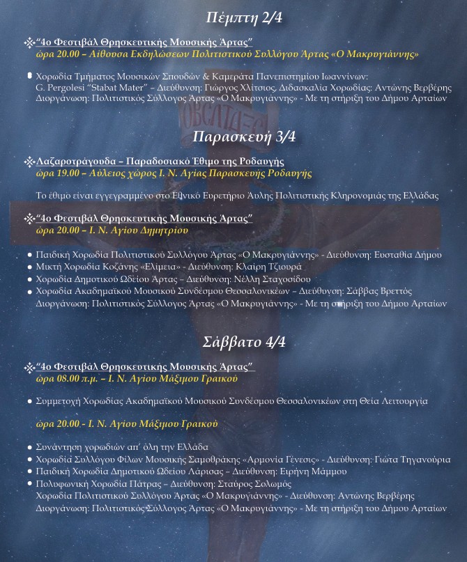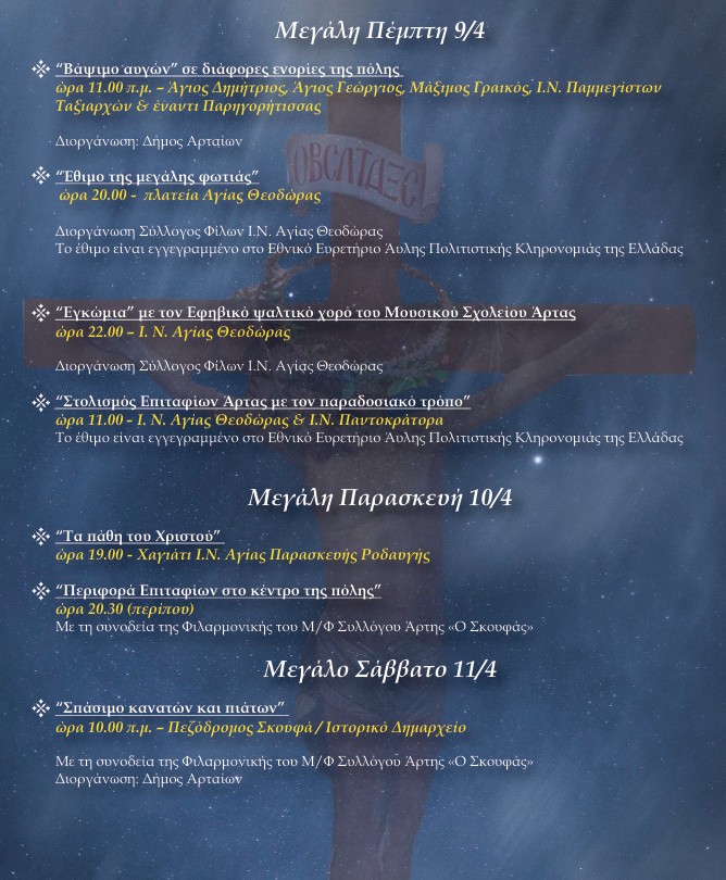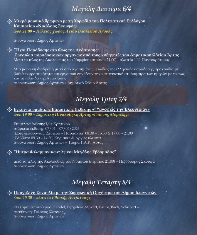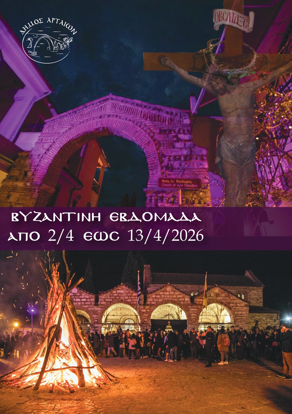 Με κατάνυξη και σεβασμό στην παράδοση, ο Δήμος Αρταίων προσκαλεί στις εκδηλώσεις της Βυζαντινής Εβδομάδας, από τις 2 έως τις 13 Απριλίου 2026. Μέσα από θρησκευτικές τελετές, πολιτιστικές δράσεις και αίσθημα συλλογικότητας, προβάλλει το βαθύ νόημα του Πάσχα, η πνευματική και ιστορική κληρονομιά.