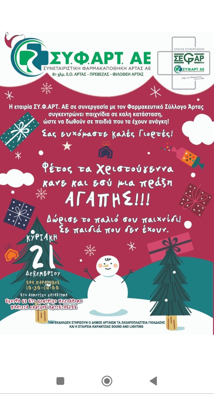 Oλοκληρώθηκε η κοινωνική δράση που υλοποιήθηκε από τη ΣΥ.Φ.ΑΡΤ ΑΕ (Συνεταιριστική Φαρμακαποθήκη Άρτας) σε συνεργασία με τον Φαρμακευτικό Σύλλογο Άρτας, με τη στήριξη του Δήμου Αρταίων, της εταιρείας Καρατζάς Sound and Lighting και των ζαχαροπλαστείων ΓΙΟΛΔΑΣΗΣ.