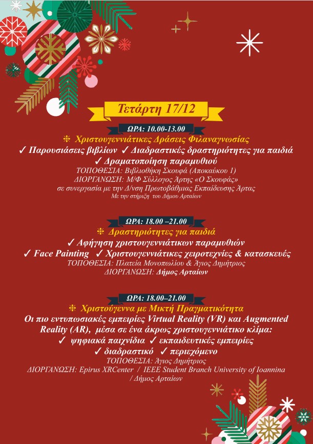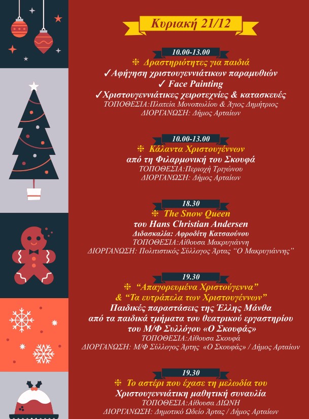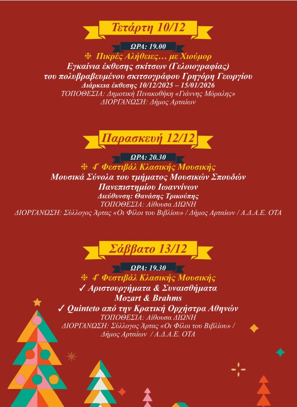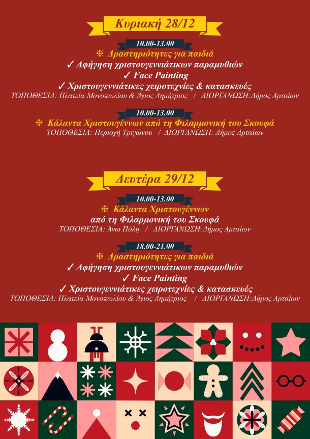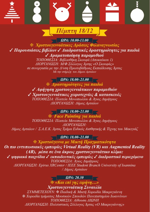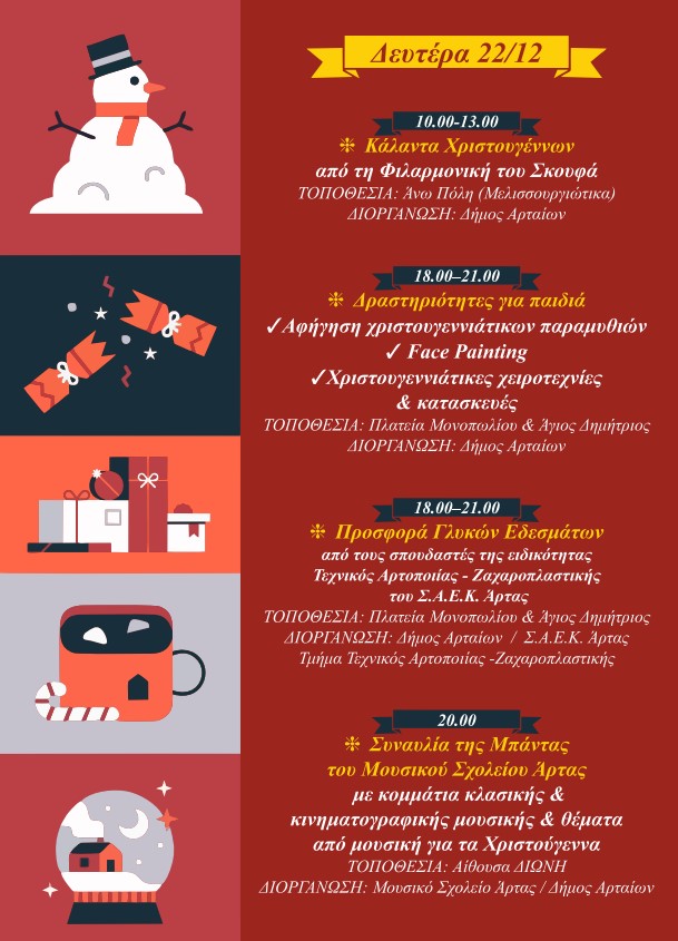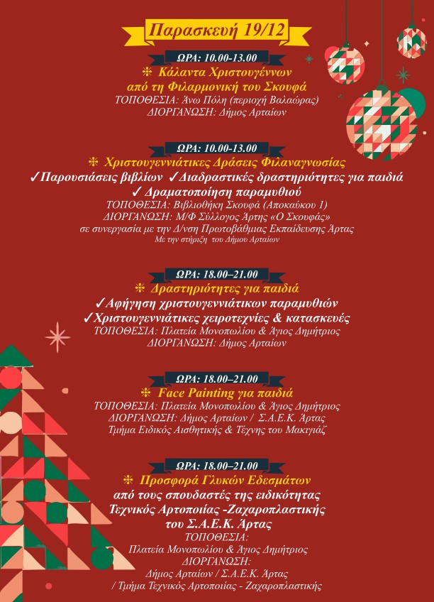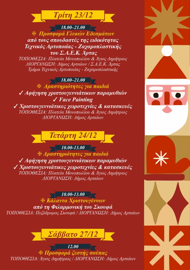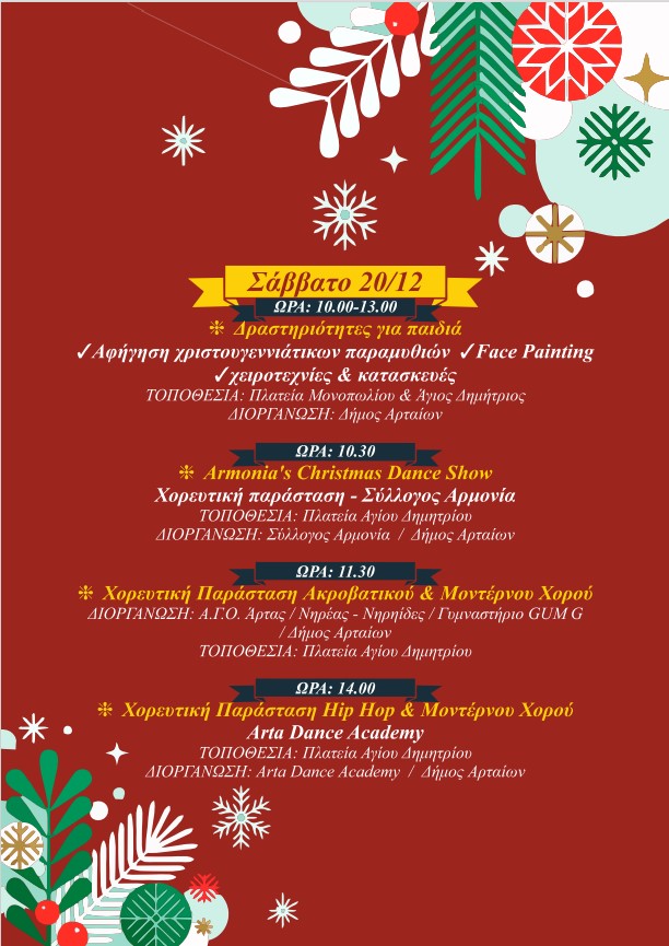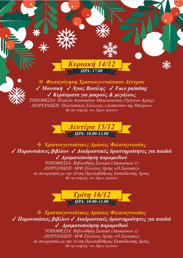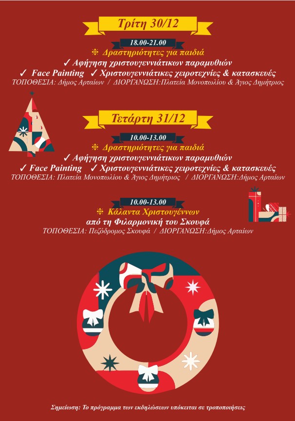 Ο Δήμος Αρταίων με ένα πλούσιο και πολυδιάστατο πρόγραμμα Χριστουγεννιάτικων εκδηλώσεων, δίνει την ευκαιρία στους Αρτινούς και τους επισκέπτες να χαρούν και να συμμετέχουν σε πολιτιστικές και ψυχαγωγικές δράσεις και να επισκεφθούν τη χριστουγεννιάτικη αγορά, ζώντας στιγμές στο πνεύμα των γιορτών.