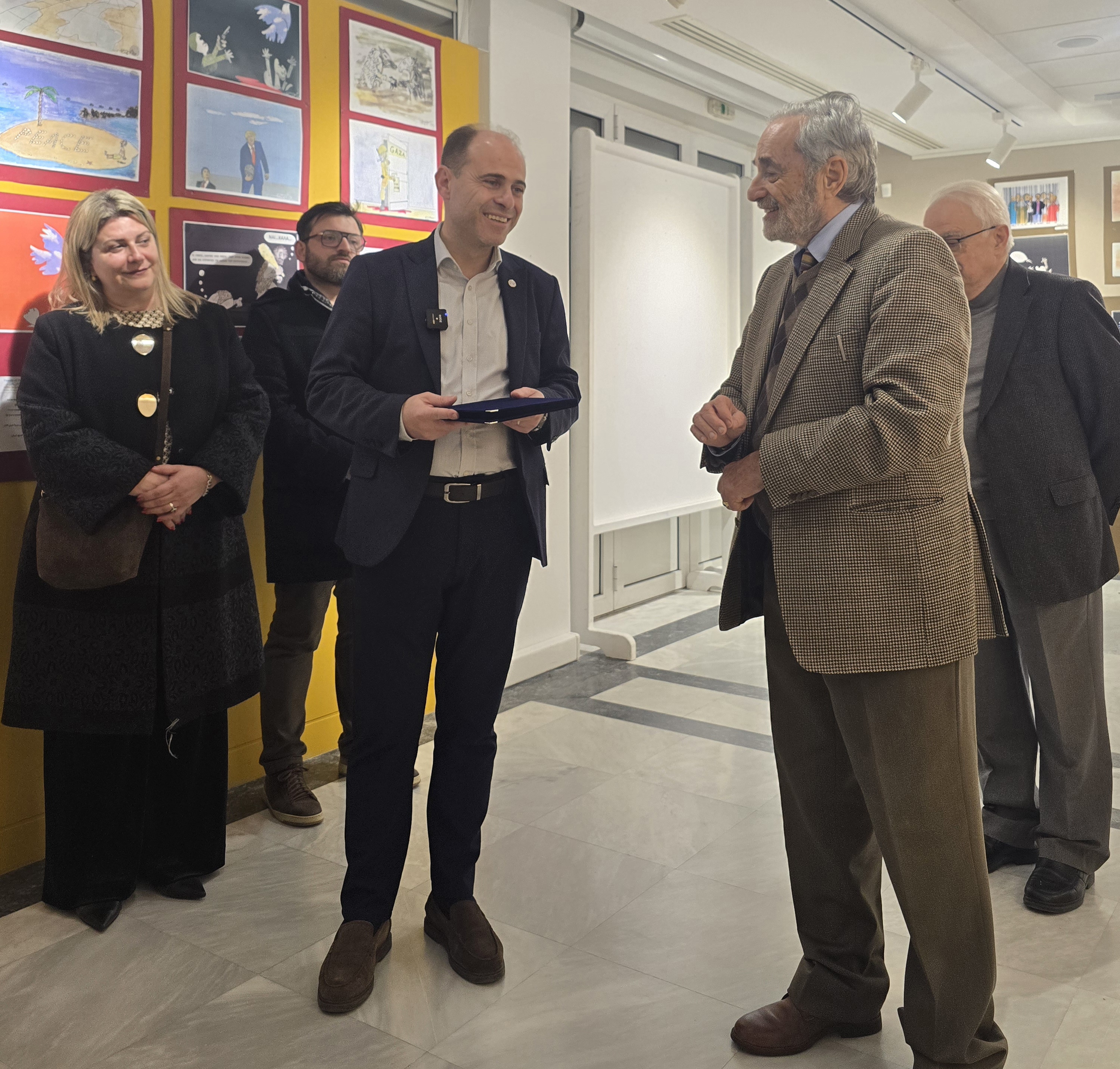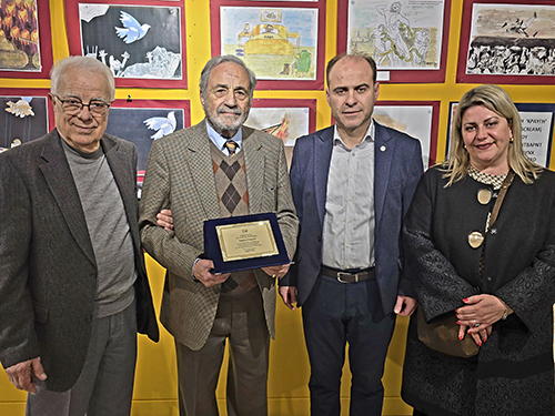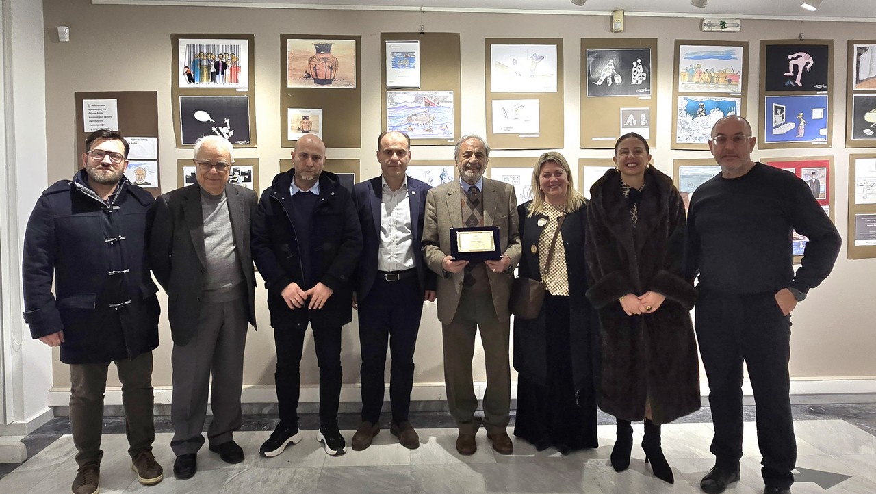 Κατά τη διάρκεια της εκδήλωσης, ο κ. Σιαφάκας απένειμε στον καλλιτέχνη την τιμητική πλακέτα, απευθύνοντάς του θερμά λόγια και εξάροντας το σπουδαίο έργο και τη διαχρονική προσφορά του στην τέχνη της σκιτσογραφίας και τη δύναμή της να σχολιάζει την κοινωνία και να αφυπνίζει συνειδήσεις.
