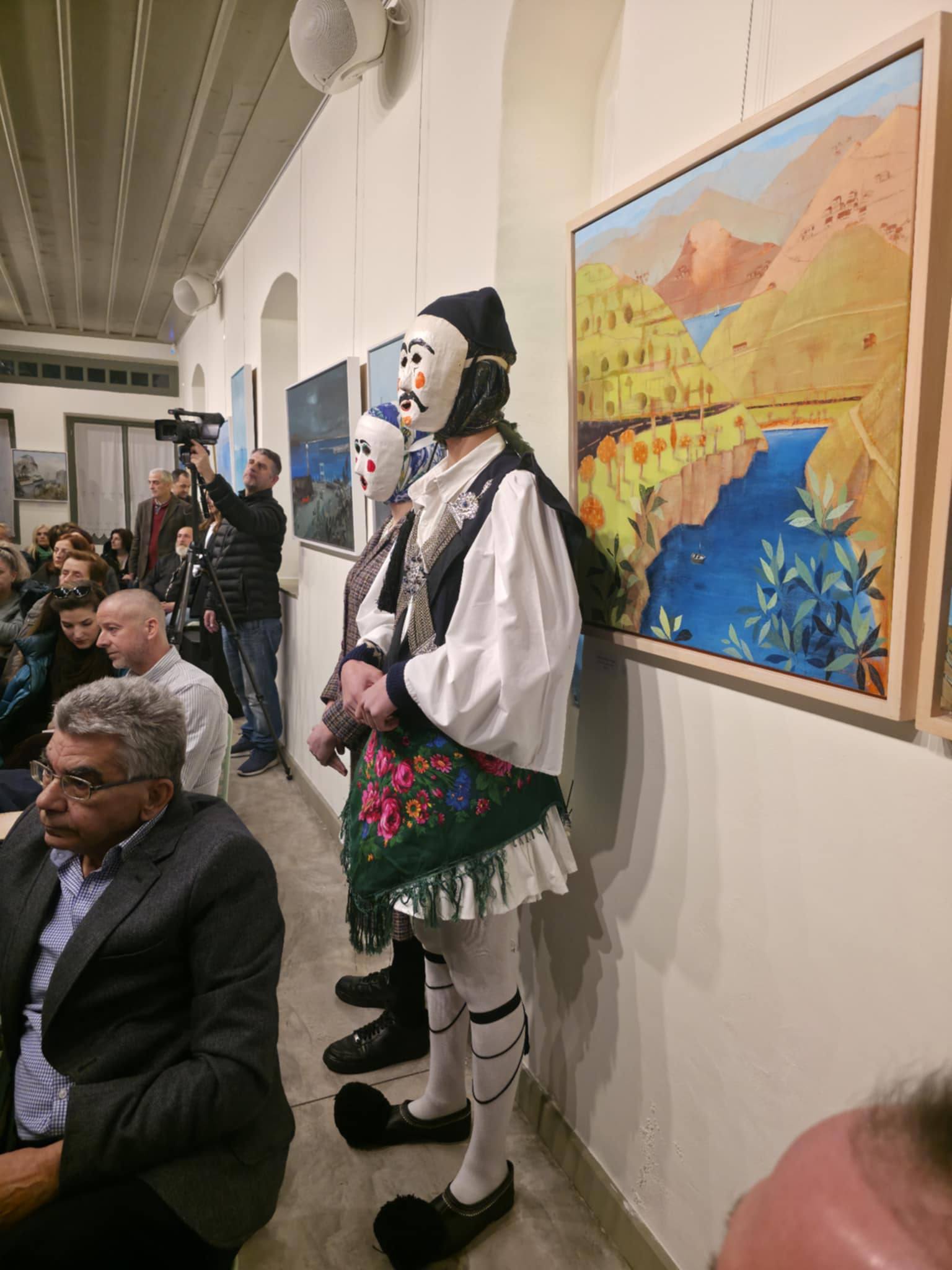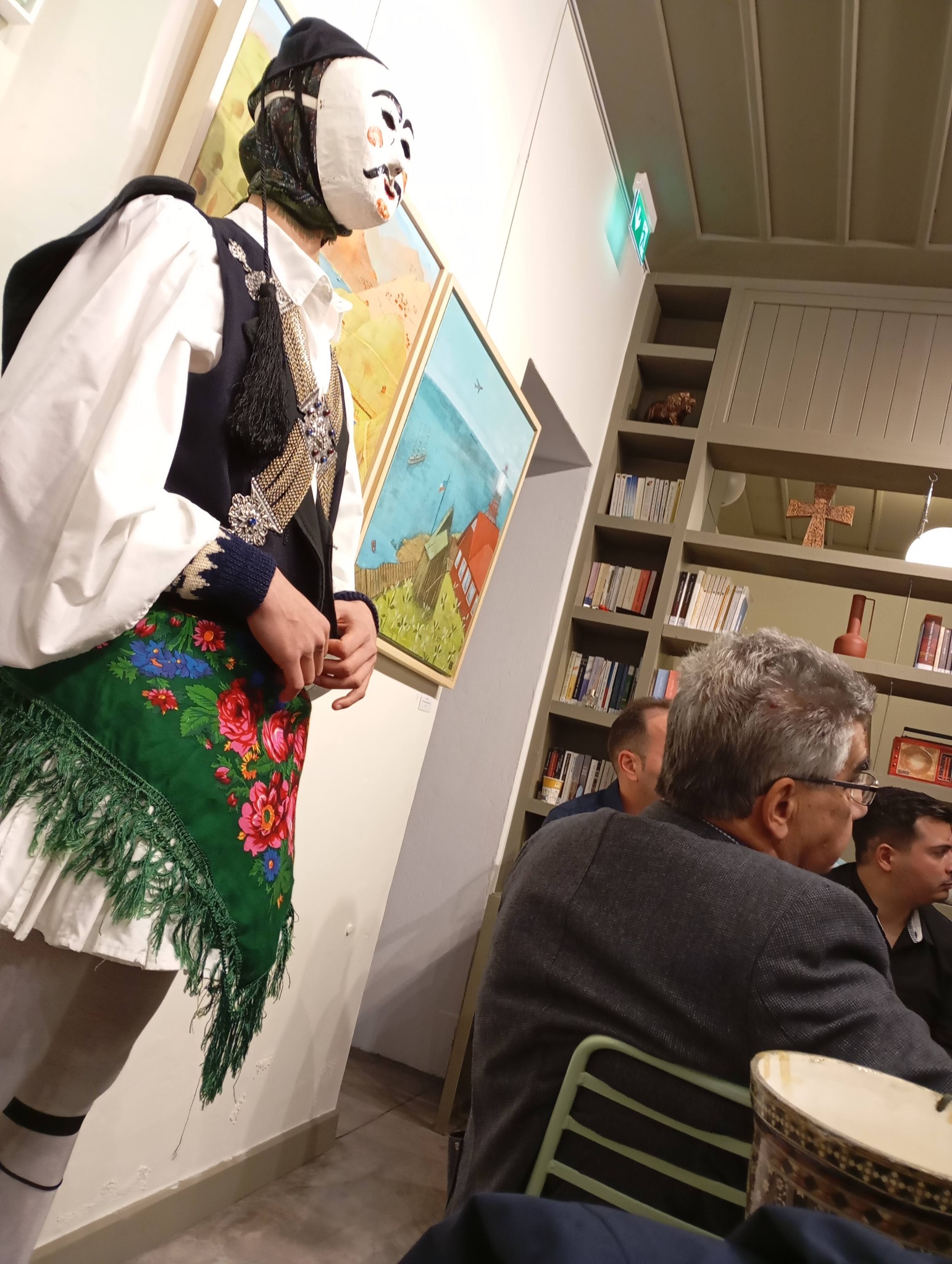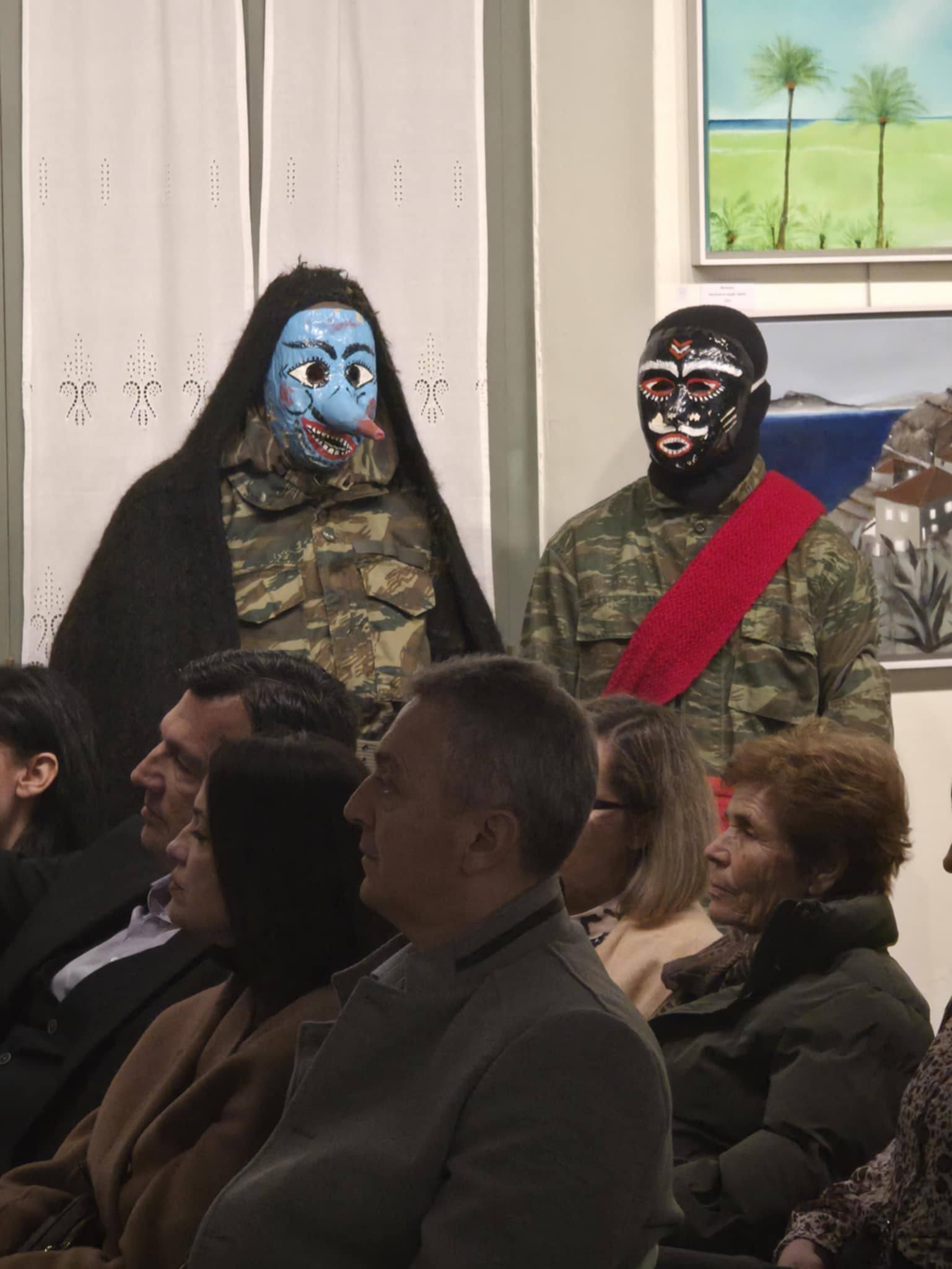 Παράλληλα, οι «πρωταγωνιστές» χορευτές του Γαϊτανακίου, με τις γνήσιες παραδοσιακές φορεσιές και τις χαρακτηριστικές προσωπίδες τους, έδωσαν ζωντανή υπόσταση στο έθιμο μέσα στην αίθουσα, μετατρέποντας την παρουσίαση σε βιωματική εμπειρία.