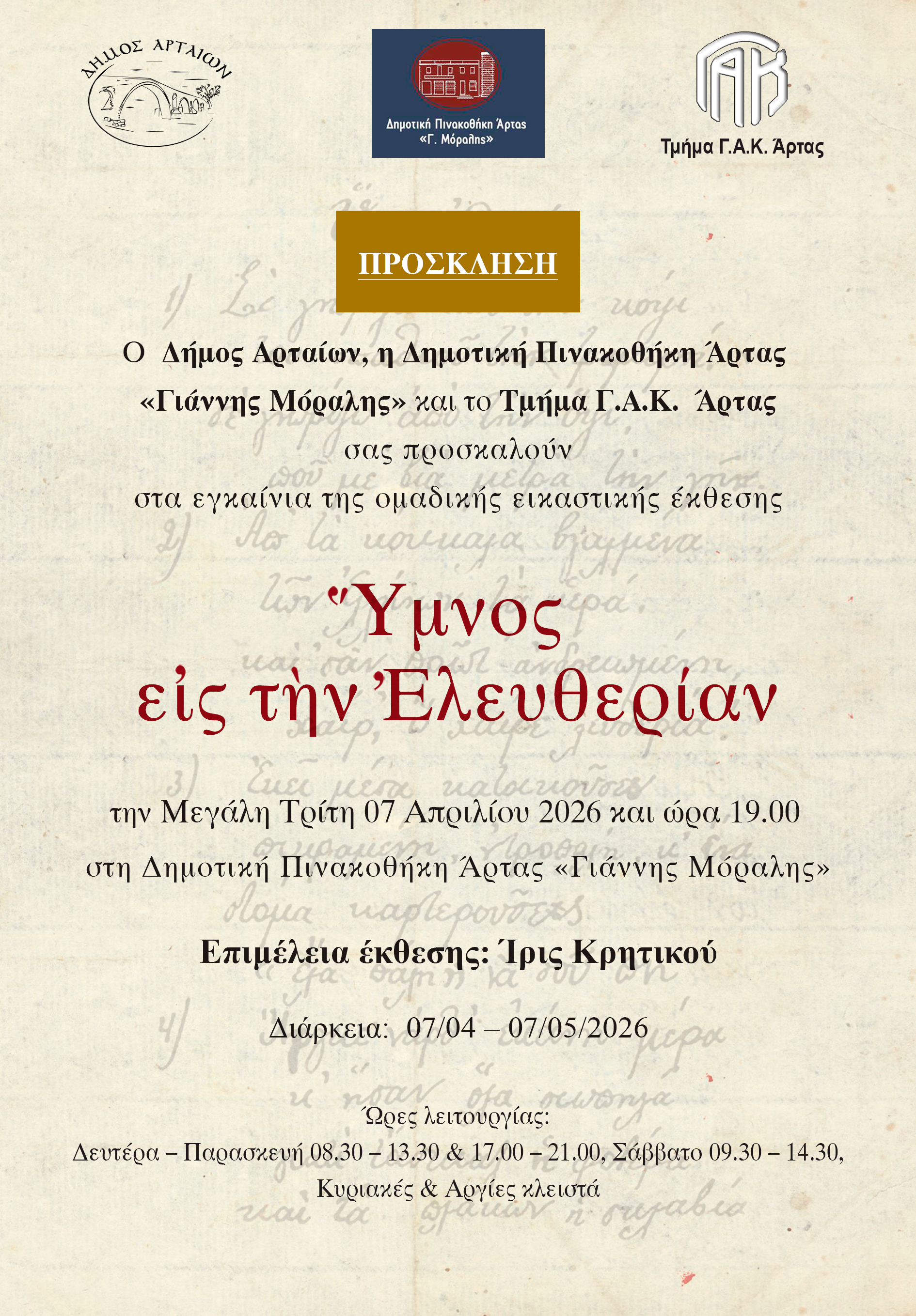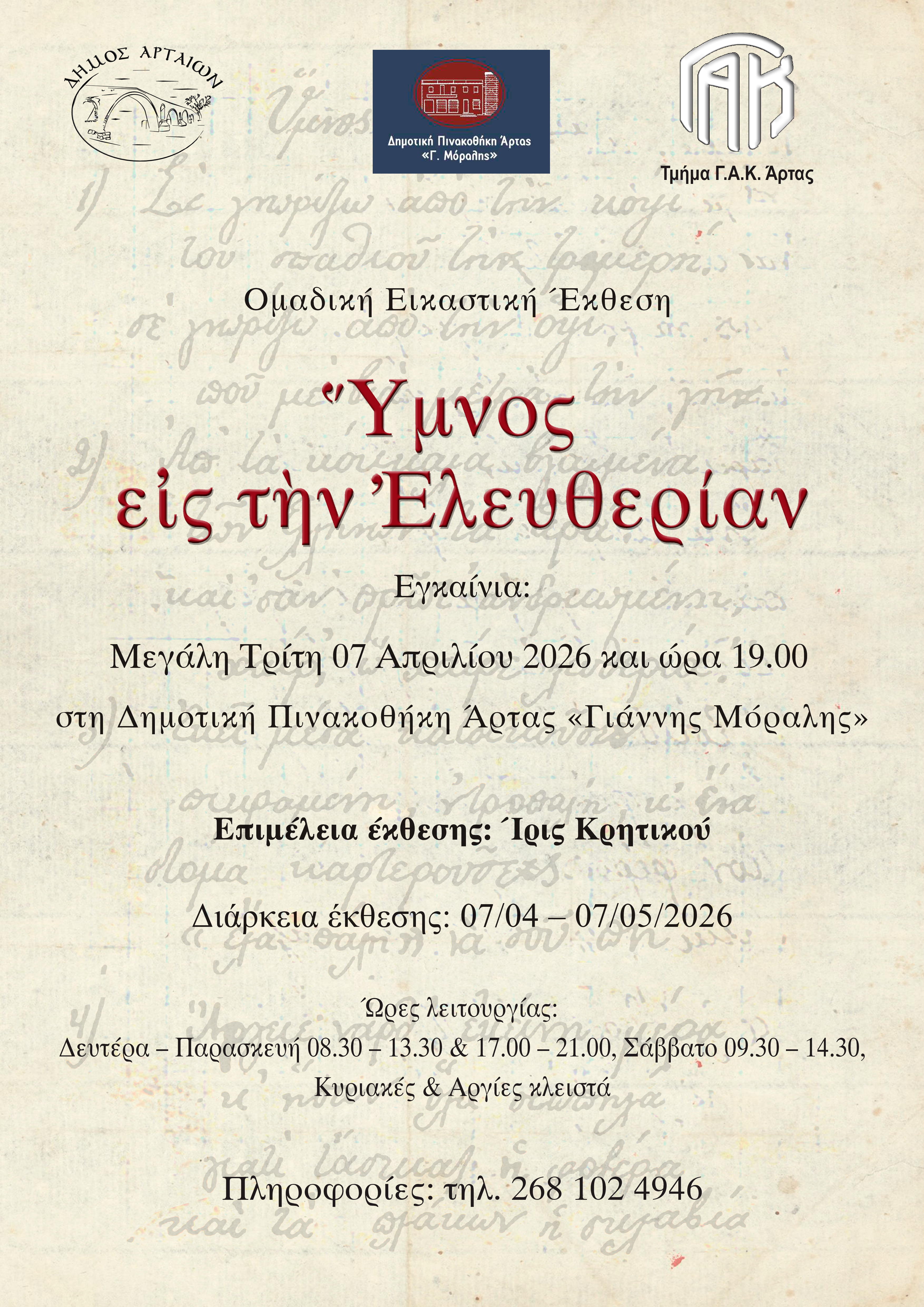 Ο Δήμος Αρταίων, η Δημοτική Πινακοθήκη Άρτας «Γιάννης Μόραλης» και το Τμήμα Γενικών Αρχείων του Κράτους (Γ.Α.Κ.) Άρτας συνδιοργανώνουν τη συλλογική εικαστική έκθεση «Ύμνος εις την Ελευθερίαν», σε σχεδιασμό και επιμέλεια της αρχαιολόγου και ιστορικού τέχνης Ίριδος Κρητικού.